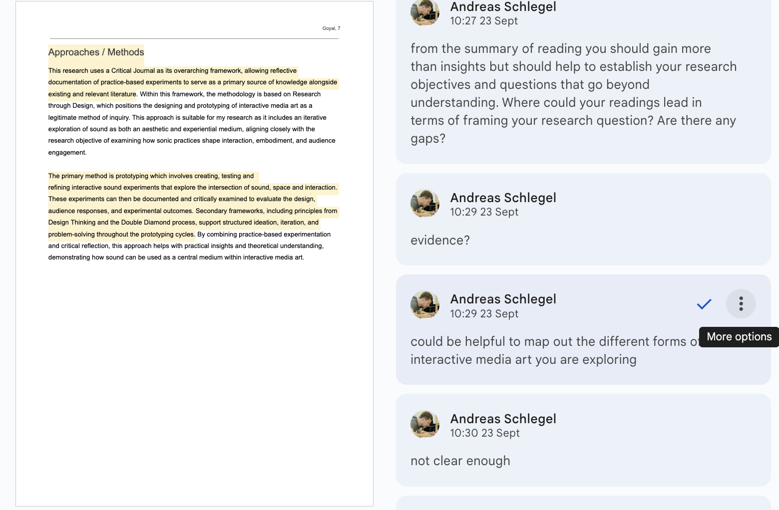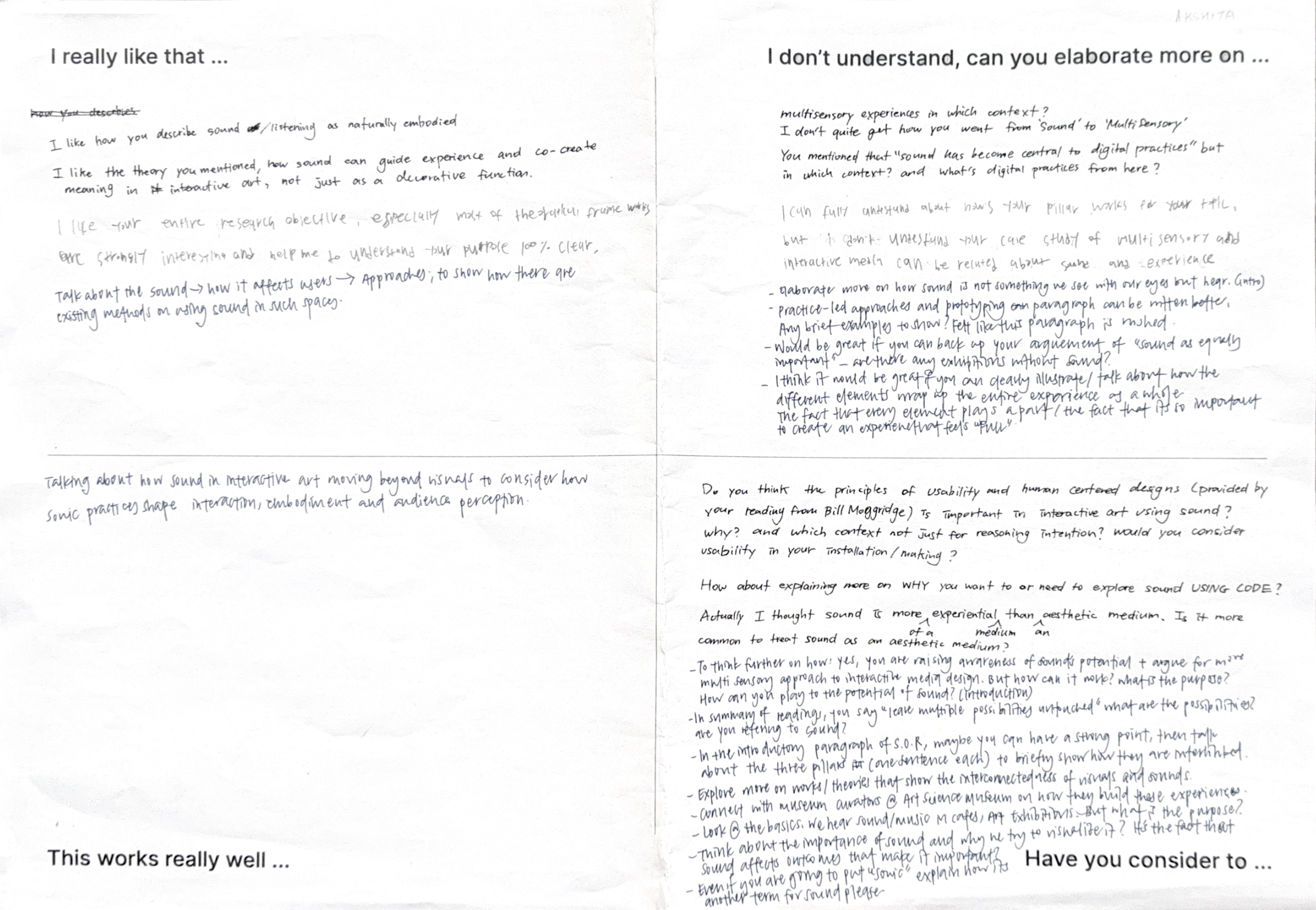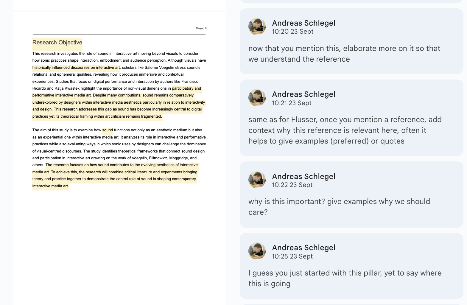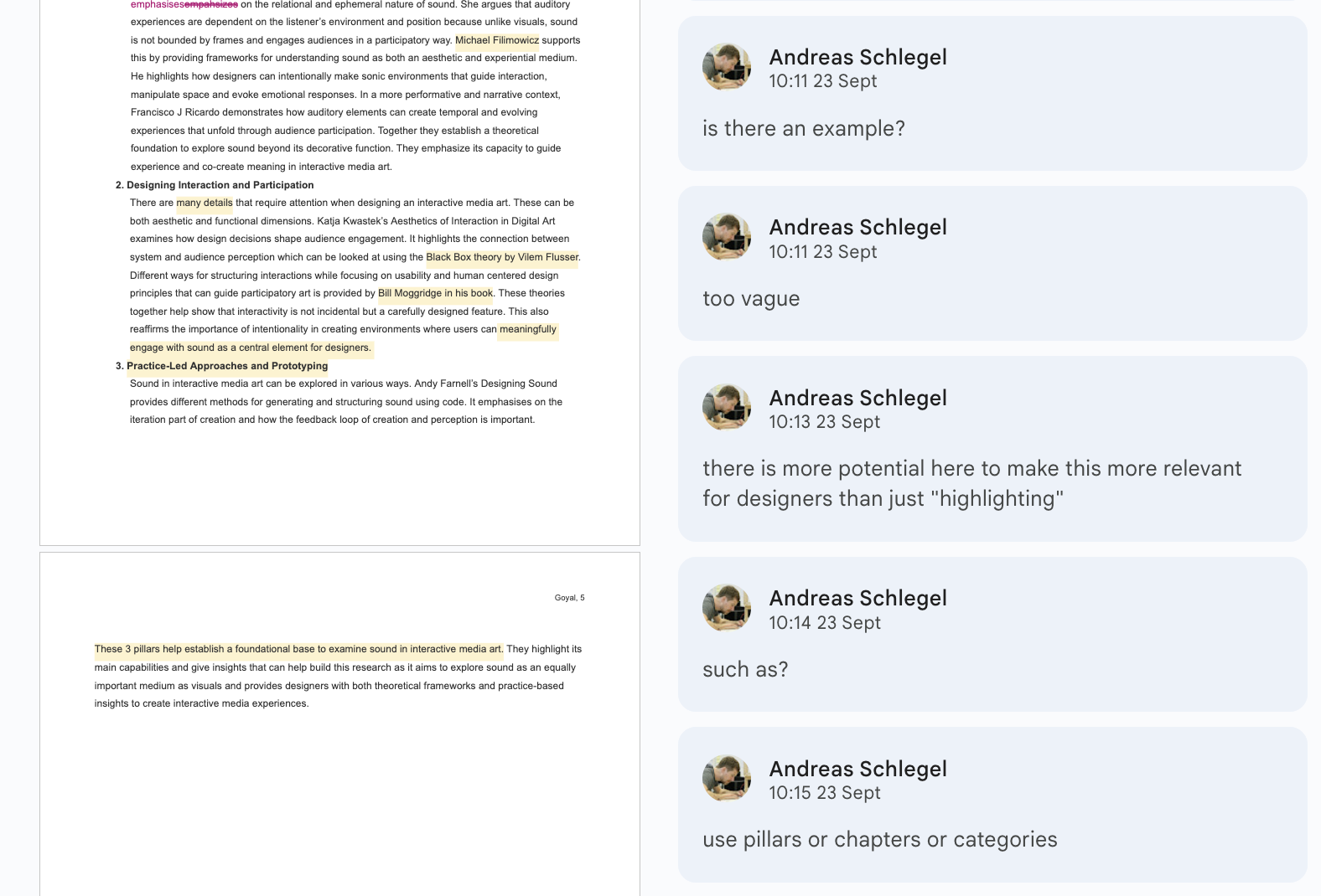 I also received feedback from Andreas at the same time which also pointed towards similar thiings my classmates did and I noticed when I was reading their papers. He also mentioned how it missed being achnored in Interactive Media Arts well and how it often missed the mark since it was vague and not well referenced. I worked on these parts after reading some other papers that he recommended me to so I can understand how professionals write them.