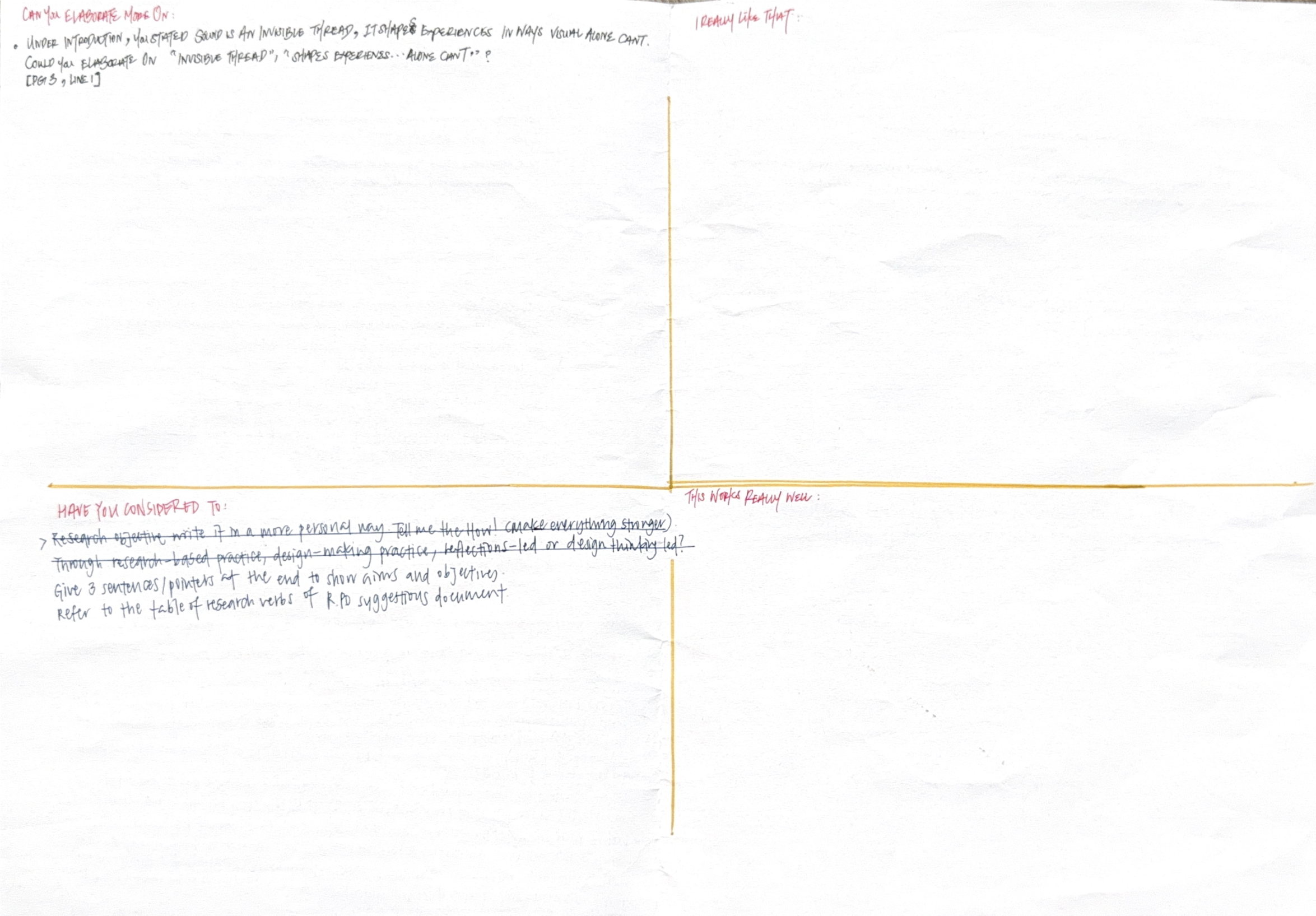 A week where I re-evaluated a lot. We had a peer review session as part of refining the RPO draft. All of us shared our drafts in class for feedback and see what they feel. The feedback was divided into 4 different parts where we share what we like, dont understand, what works well and what can be considered.