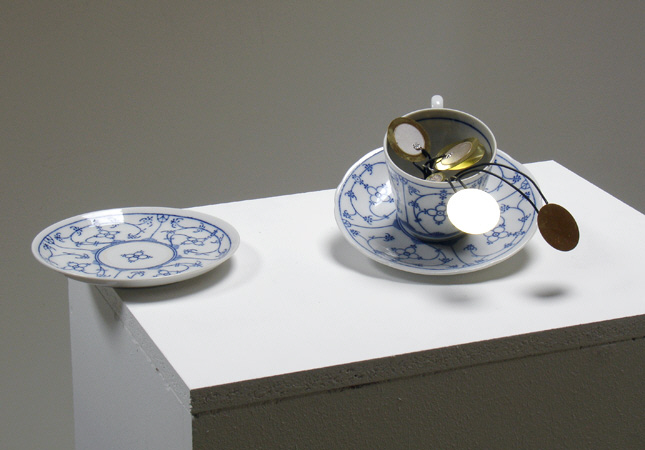 Minimal sounds created by the slight vibration of several small piezo loudspeakers against the porcellaine rim of a tea-cup. A very instable setup (Artist website) -
